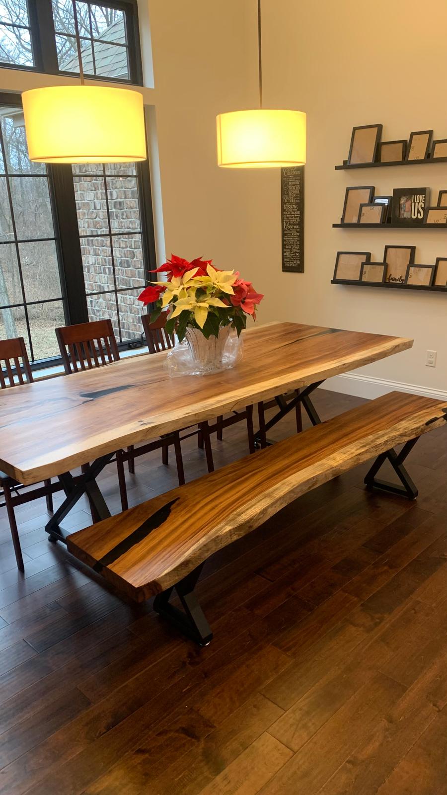 Gather around something real. This solid wood live-edge table and bench set blends rustic beauty with modern design, showcasing stunning natural grain and organic edges. Built to last, designed to impress, and ready to host years of memories.